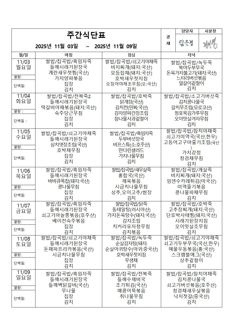 2025년 11월 1주 식단표