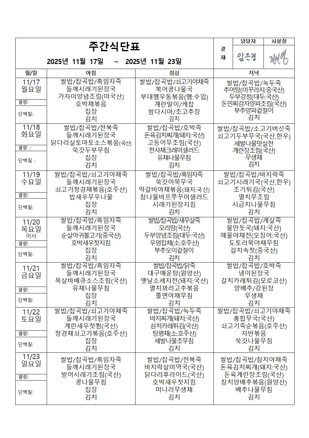 2025년 11월 3주 식단표
