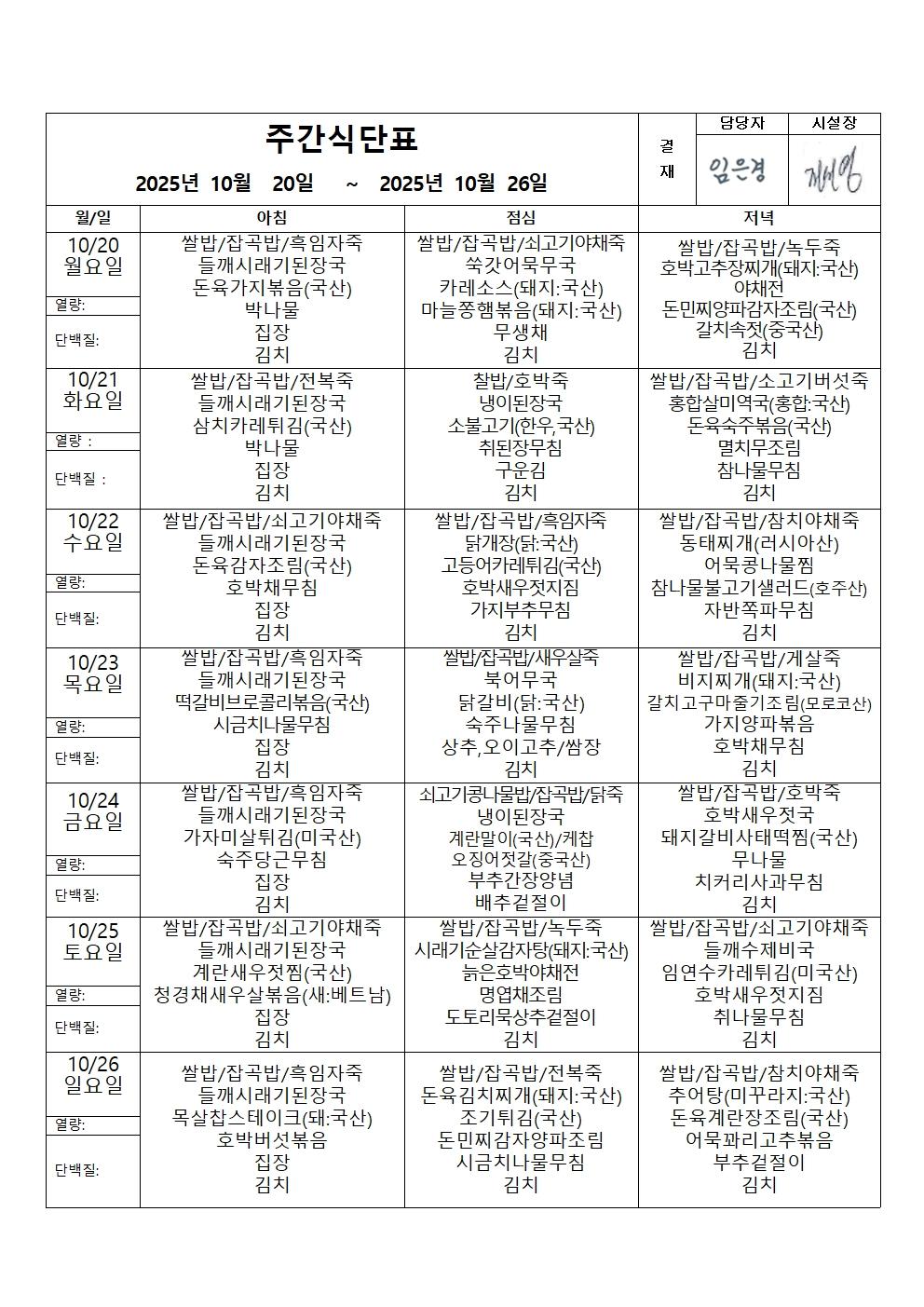2025년 10월 5주 식단표